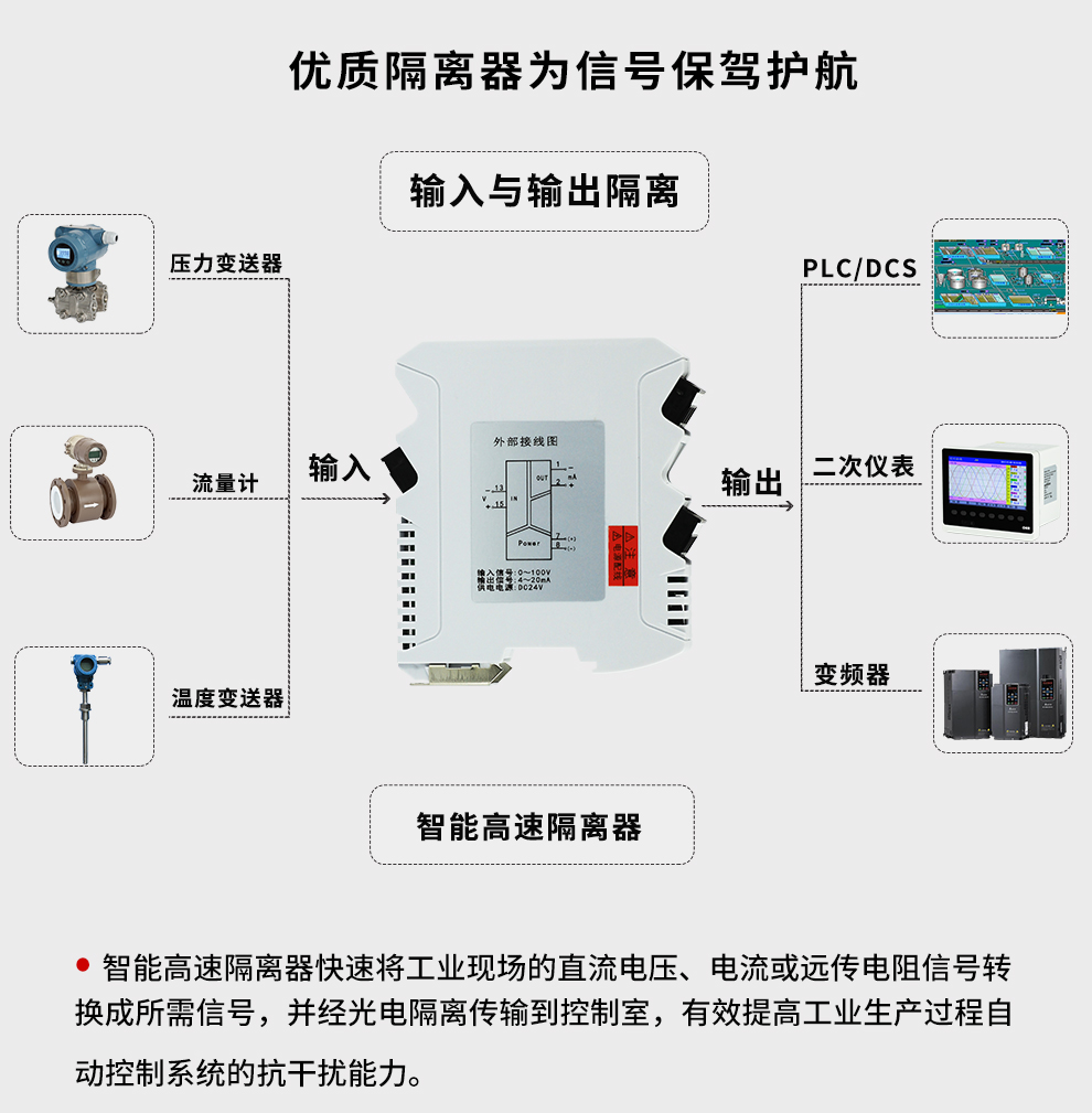 OHR-M38系列智能高速隔離器將工業現場的直流電壓、電流或遠傳電阻信號轉換成所需信號,經隔離傳輸到控制室,有效提高工業生產過程自動控制系統的抗干擾能力。