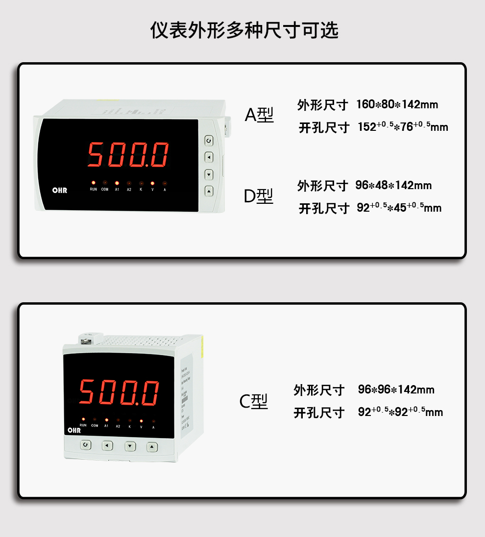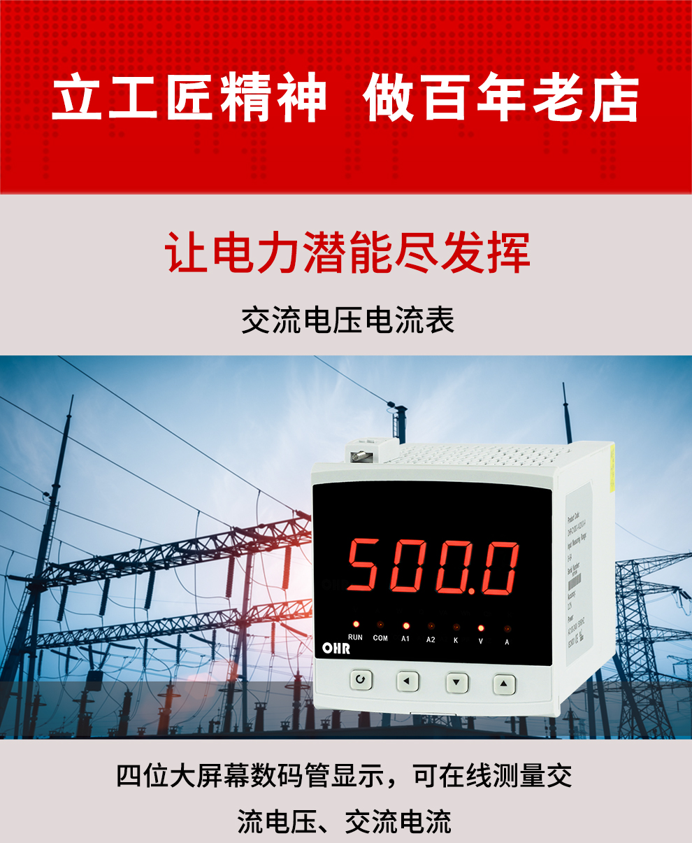OHR-C200系列交流電壓/電流表為新 一代可編程智能儀表,它采用大規模集成電路,應用數字采樣技術,對單相電氣線路中的電壓、電流進行實時測量、顯示和控制,并通過RS485接口或模擬量變送輸出接口對被測量電量數據進行遠傳。